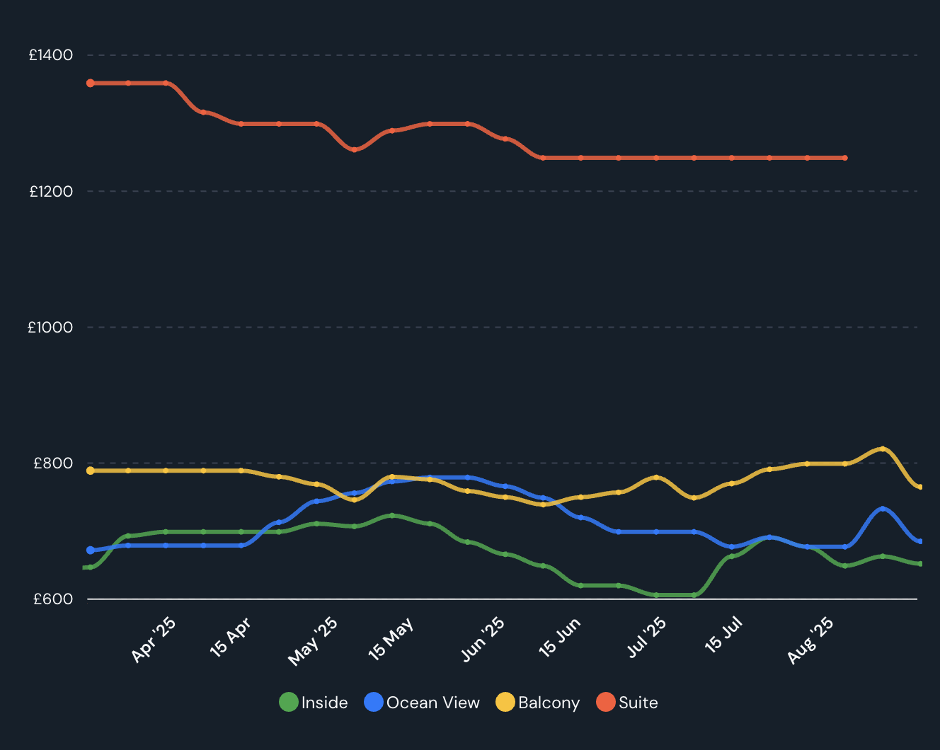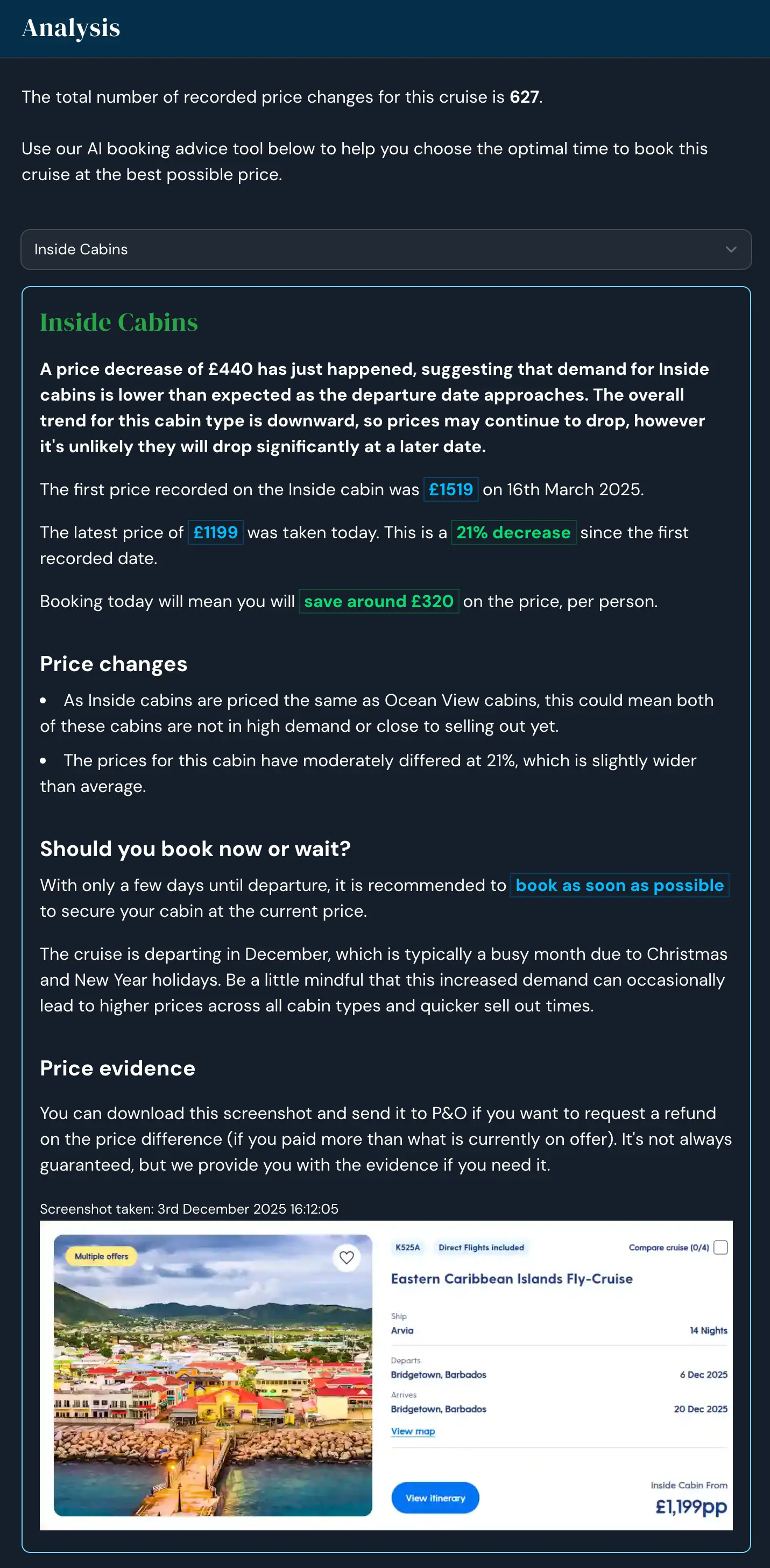 Cruise Prices tracks fares in real time, alerts you to price drops, and uses intelligent AI analysis to advise you on when to book your holiday.